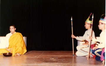 | ーー舞台中央に釈尊と弟子たち、大王、礼拝して | ・ |